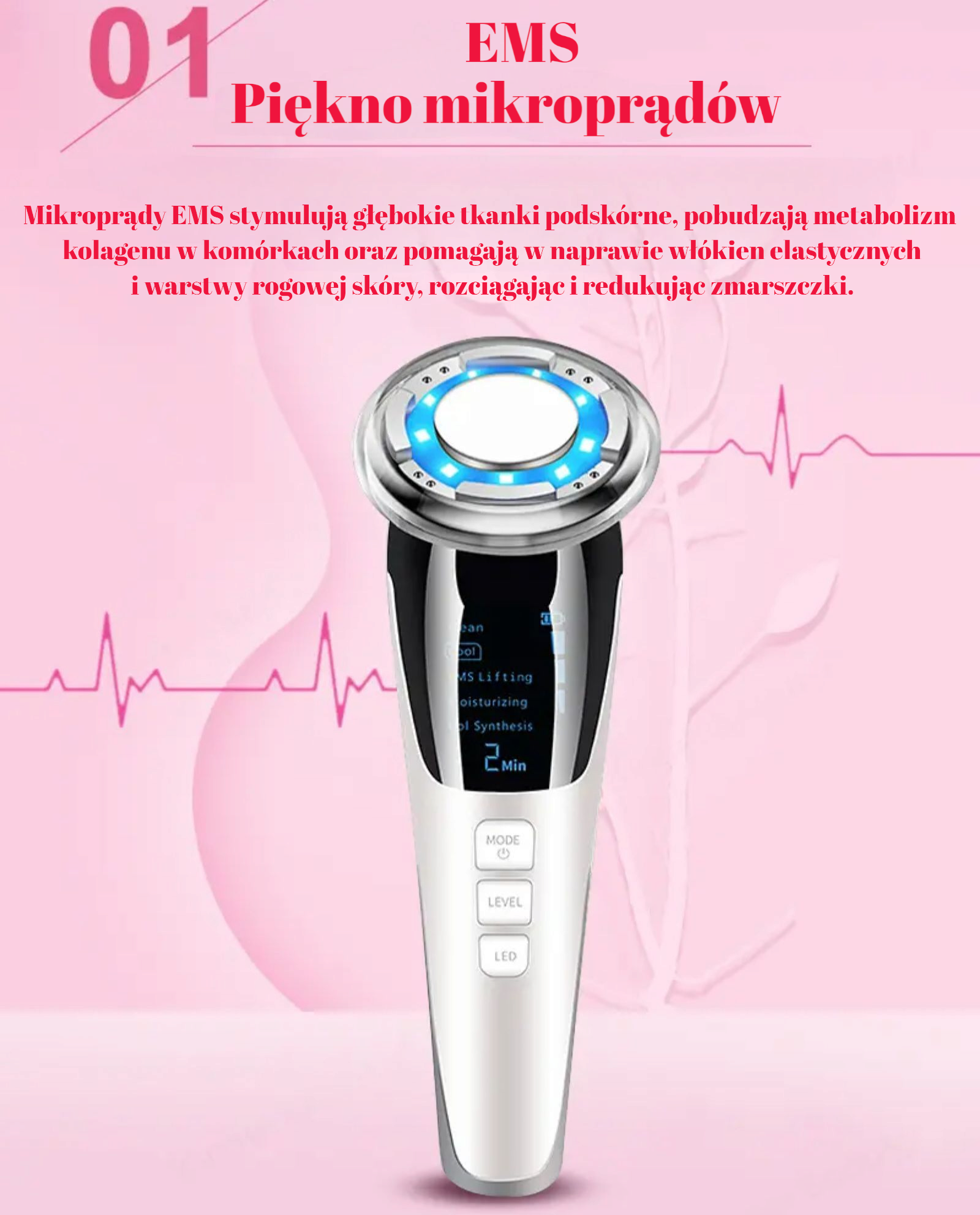 – wprowadzanie składników aktywnych w głębokie warstwy skóry bez bólu i igieł.EMS – elektrostymulacja mięśni twarzy